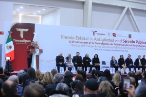 Durante la ceremonia en el Polyforum de esta capital, en la que se entregaron de manera simbólica 23 reconocimientos, medallas y estímulos económicos de un total de 1,453 a trabajadores que han cumplido entre 20 y 55 años de servicio en el Gobierno de Tamaulipas, el jefe del Ejecutivo estatal se refirió a la visita que realizó la presidenta Claudia Sheinbaum, quien trajo grandes beneficios y oportunidades para el desarrollo del estado y para seguir logrando el bienestar y la justicia social, así como coadyuvar al crecimiento y desarrollo de nuestra nación.