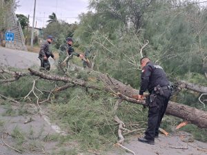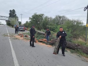 Güémez, Tamaulipas.- Al implementar el Operativo Invierno Seguro Héroes Paisanos 2025 personal de la Guardia Estatal en el municipio de Güémez, retiró un árbol que obstruía la vialidad en la Carretera Federal 85 Victoria-Monterrey.